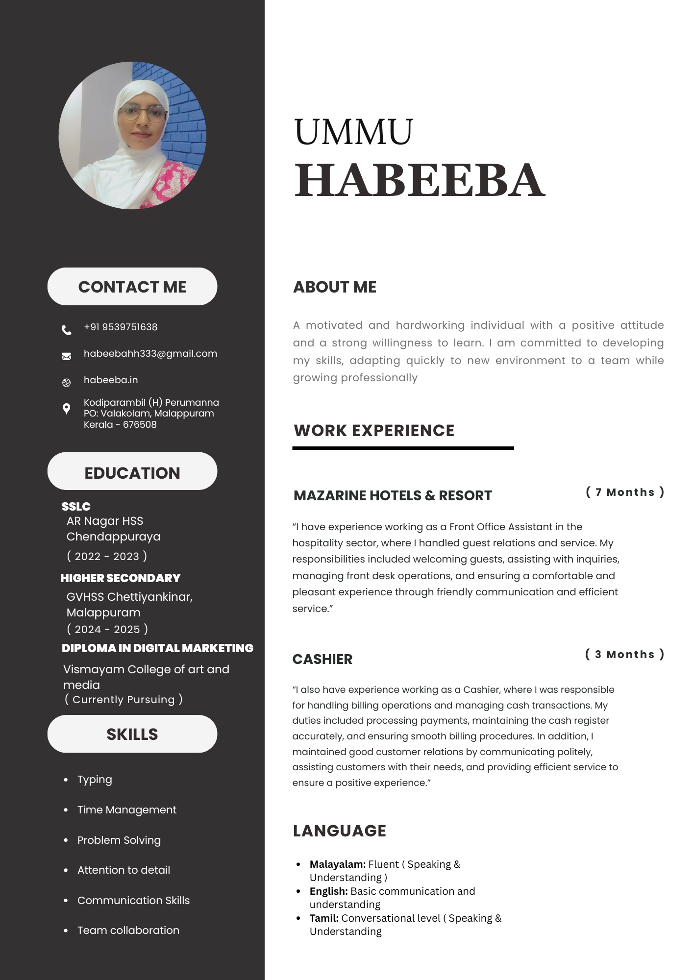 Hi, I’m Ummu Habeeba, best Digital Marketer in Malappuram, Kerala. After my studies, I enrolled in a Digital Marketing course at Vismayam College of Arts & Media to start my career as a digital marketing strategist.